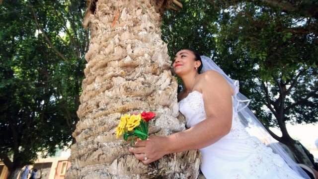De véu e grinalda, mulheres se casam com árvores no México