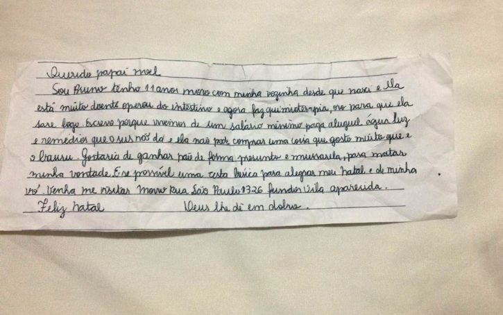 Em carta ao Papai Noel, menino de 11 anos pede pão, presunto e muçarela de presente