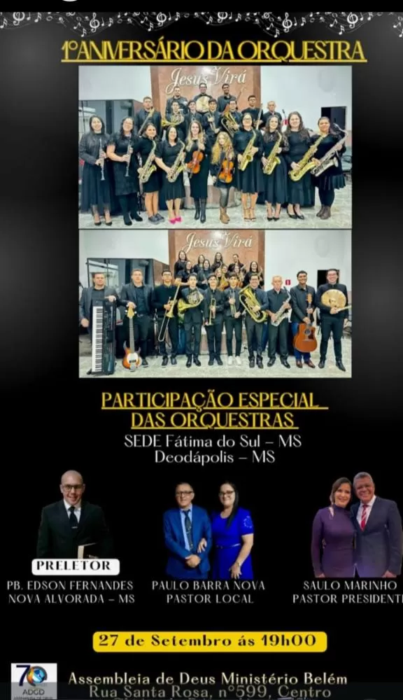 Regiaoonline Música e Fé: Em Glória de Dourados, Igreja Assembleia de Deus realizará 1o Aniversário da Orquestra neste sábado.